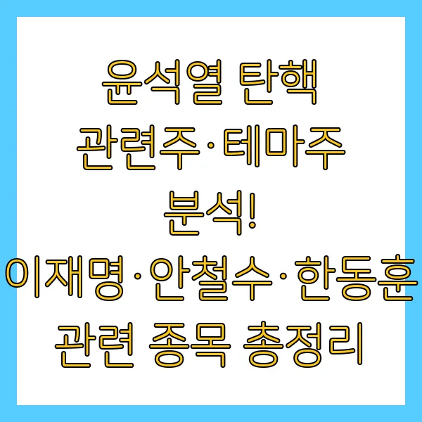 최근 정치권의 뜨거운 감자로 떠오른 윤석열 탄핵 이슈 , 과연 주식 시장에는 어떤 영향을 미칠까요? 윤석열 대통령 탄핵 추진에 대한 배경과 현재 상황을 살펴보고, 관련된 정치 테마주 들을 분석해 보겠습니다. 이재명 , 안철수 , 한동훈 등 탄핵 이슈와 연관된 주요 정치인 관련주 는 무엇이며, 그 움직임을 예측해 보는 시간을 갖도록 하겠습니다. 단순한 테마주 분석을 넘어, 실제 투자 전략과 유의사항 까지 꼼꼼하게 짚어드리겠습니다. 지금부터 함께 알아보시죠.