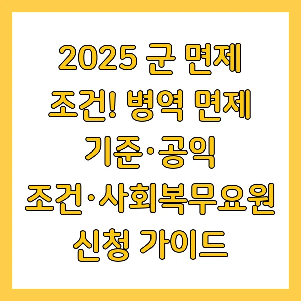2025년, 군 면제 조건 은 어떻게 될까요? 병역 면제 기준 부터 공익 판정 조건 , 사회복무요원 신청 가이드 까지, 이 글 하나로 여러분의 궁금증을 완벽하게 해소해 드리겠습니다.