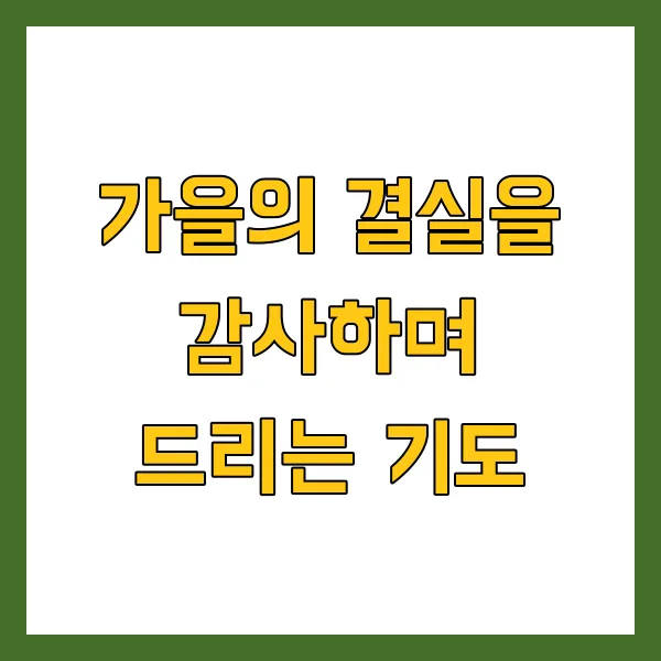 가을의 풍성한 결실처럼 저희의 신앙도 더욱 깊어지기를 소망합니다. 주님의 말씀을 묵상하고 실천하며, 성령님의 인도하심을 따라 살아가는 저희가 되게 하옵소서. 이 계절에 저희가 더욱 겸손한 마음으로 주님을 섬기며, 사랑과 헌신으로 공동체에 봉사하게 하옵소서. 신앙 성장을 통해 저희의 삶이 더욱 풍요로워지고, 주님의 사랑을 세상에 전하는 도구로 쓰임 받게 하옵소서.